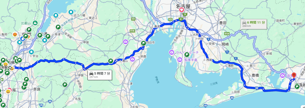 - 大阪→浜松まで下道:約4時間30分(休憩含まず)