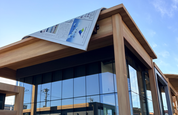 建物全体がカフェの机や椅子となっているインパクト抜群の建物で、写真スポットとして大人気。